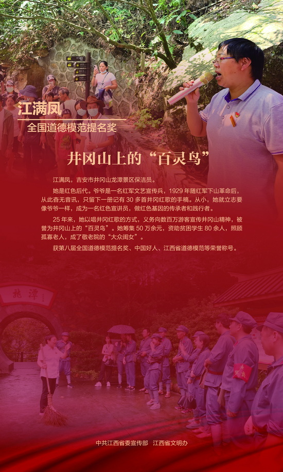 在中国革命摇篮井冈山,有一位普通而不平凡的红军后代,她叫江满凤,现年51岁,是小井村红军烈士江治华的孙女,也是井冈山龙潭景区的保洁员,还是群众公认的“活雷锋”。从小,受爷爷留下的唯一一本30首井冈红色歌曲本和父亲常年乐善好施的影响,江满凤立誓继承爷爷遗志,传承红色基因,把弘扬井冈山精神、扶危济困献爱心当成毕生追求,积极参与社会公益事业,赢得“红色百灵”“春蕾妈妈”“大众闺女”“爱心大使”等雅号,书写了一位草根红三代的“雷锋”故事。