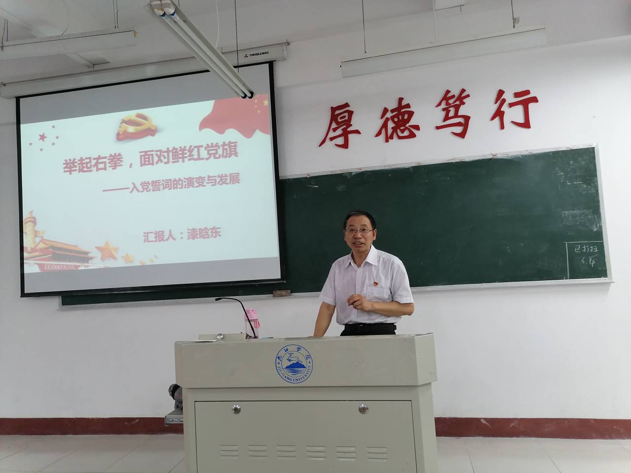 表彰结束后,漆晗东书记带领全体党员重温入党誓词,并给全体党员讲授了题为《举起右拳,面对鲜红党旗》的微党课,系统讲解了入党誓词的演变过程。