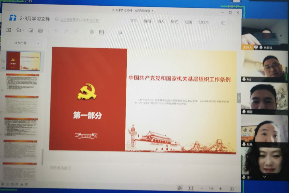 按照经管学院党委部署要求,3月18日,经管学院教工第四党支部党员在家召开腾讯视频会议,学习习近平总书记近期疫情防控重要讲话精神,《2019—2023年全国党政领导班子建设规划纲要》、《党委(党组)书记抓基层党建工作述职评议考核办法(试行)》、《中国共产党党和国家机关基层组织工作条例 》。此次会议由林敬松同志主持,教工四支部党员参加了此次网络视频会议。