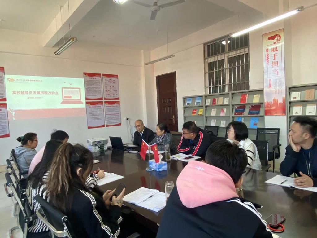 谢书记通过辅导员的发展历程指出新时代辅导员是开展大学生思想政治教育的骨干力量,是高等学校学生日常思想政治教育和管理工作的组织者、实施者、指导者,在促进大学生全面成才、培养社会主义事业合格建设者和接班人、维护高校稳定方面肩负着重要职责。辅导员应当努力成为学生成长成才的人生导师和健康生活的知心朋友。要求大家要牢固树立“工作光荣、责任重大”的观念、“以人为本、因材施教”的理念、“苦干实干、乐于奉献”的精神、“严于律己、为人师表”的意识,不断提高工作能力和业务水平,促进学生全面发展。