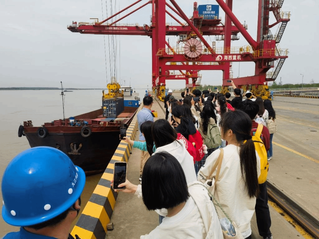 4月10日下午,师生们首先来到了九江红光国际港。作为区域内重要的水运物流中心,九江红光国际港展示了现代化港口的运作流程和先进的物流技术。学生们在港口工作人员的引导下,参观了货物的装卸区、集装箱堆场,并听取了关于港口日常运营的详细介绍。此次活动使学生们对国际贸易的物流环节有了更加直观的感受,对港口在促进地区经济发展中的作用有了更深刻的认识。