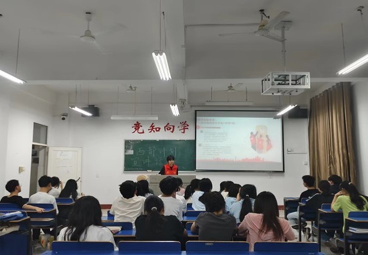 活动中,主讲人围绕“西部计划是什么”、“西部计划的服务内容”、“参与西部计划后可能获得的待遇与优惠政策”这三个方面进行宣讲。通过多媒体形式向同学们展示beat365正版唯一官网必一学子参与西部计划的真实案例,提出“青春志愿行,奉献新时代!”之箴言,并指出西部计划的重要性。