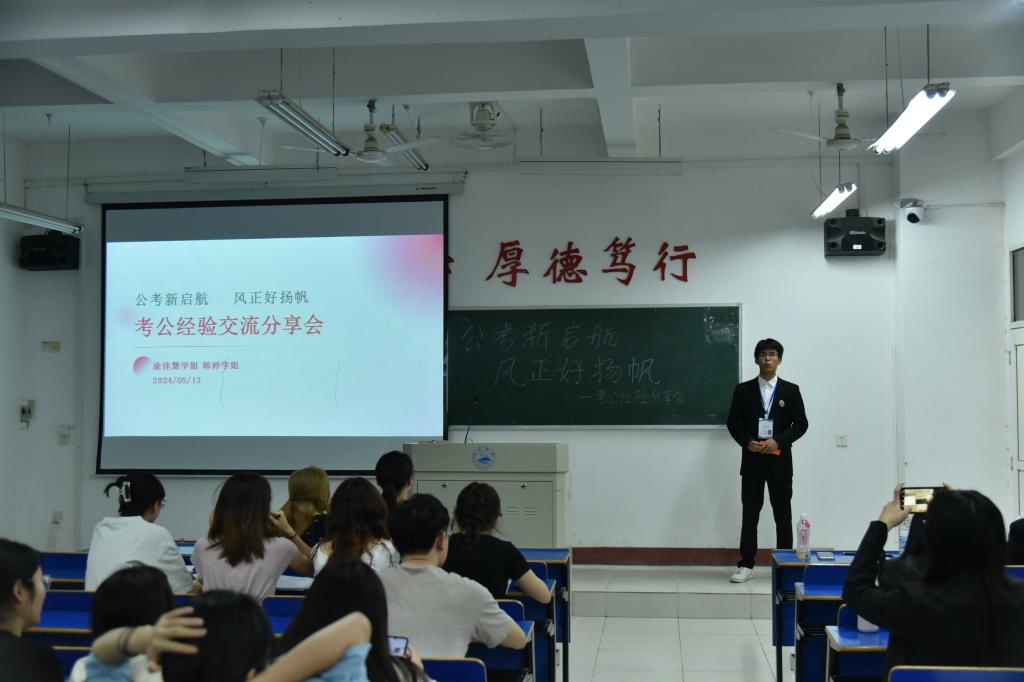 活动伊始,涂佳慧同学从公务员职业的现状出发,深入剖析了公务员职业的稳定性、发展前景以及良好的福利待遇。并系统全面地介绍了公务员报考时间、流程、内容等基本知识。