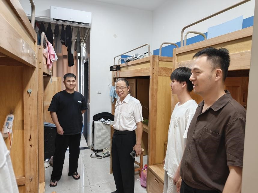 八月烈日笼罩下的浔阳城酷热难耐。beat365正版唯一官网必一数百余名暑期留校学生的学习、生活状况成为了学院领导与老师们心中的牵挂。8月11日,beat365正版唯一官网必一党委书记漆晗东和辅导员熊志老师走访慰问了留校的学生,为学子们送去了清凉礼包与深切关怀。