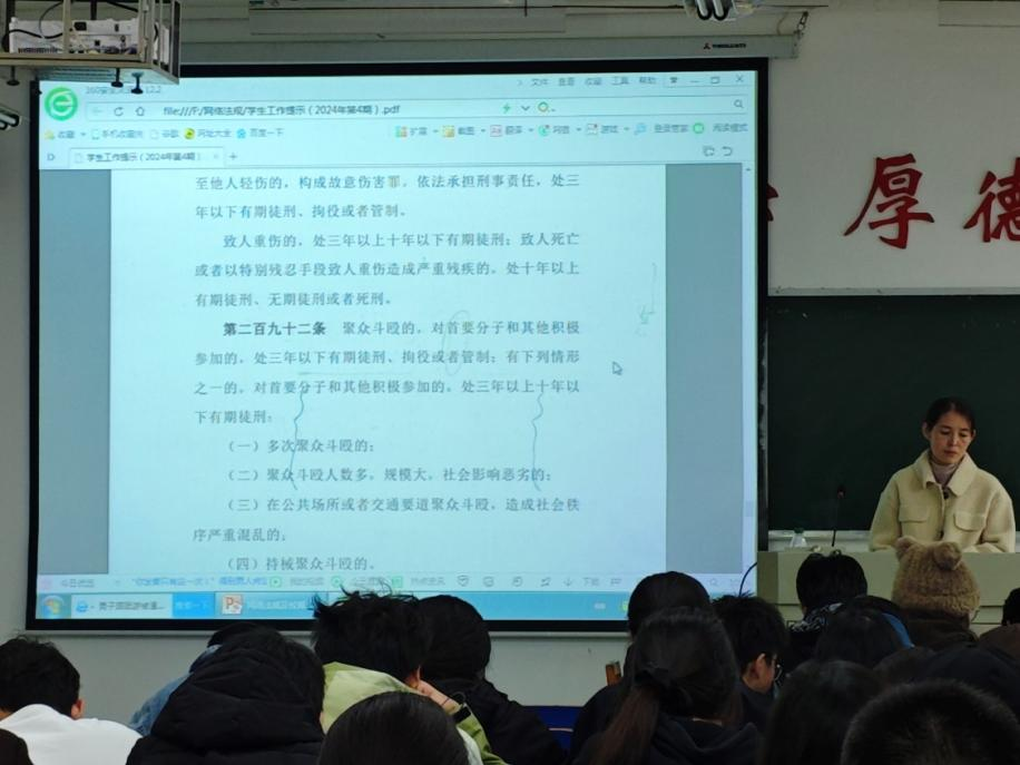 紧接着,各位班主任老师为同学们解读了有关互联网信息浏览、传递的相关法律法规,并重点强调了学校对学生“虚假信息”传播等违纪违规行为的处分管理规定。通过专题教育,让同学们更进一步明确了在虚拟网络空间维护和行使自身的权利,规范个人行为的重要性。活动最后,学院向同学们发出了依法上网、绿色上网、文明上网、安全上网的倡议,呼吁同学们提高法治素养,共同营造良好网络环境。