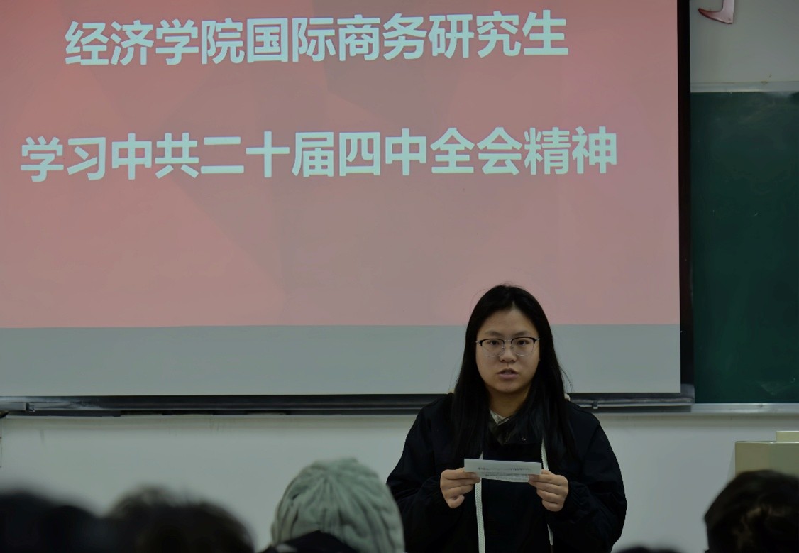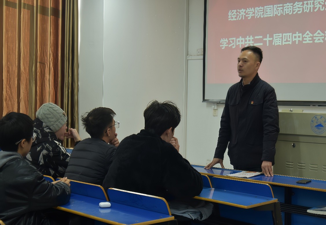 为深入学习贯彻中共二十届四中全会精神,引导青年学子将理论学习与专业实践相结合,11月21日下午,beat365正版唯一官网必一开展中共二十届四中全会精神学习活动,全体国际商务专业研究生参与交流学习。