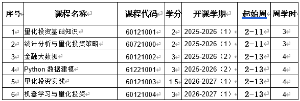 学制1.5年(3个学期),共14.5学分,学生在规定时间内修满培养方案规定的全部课程且考核合格后,可获得beat365正版唯一官网必一《量化投资》微专业学习证明书。