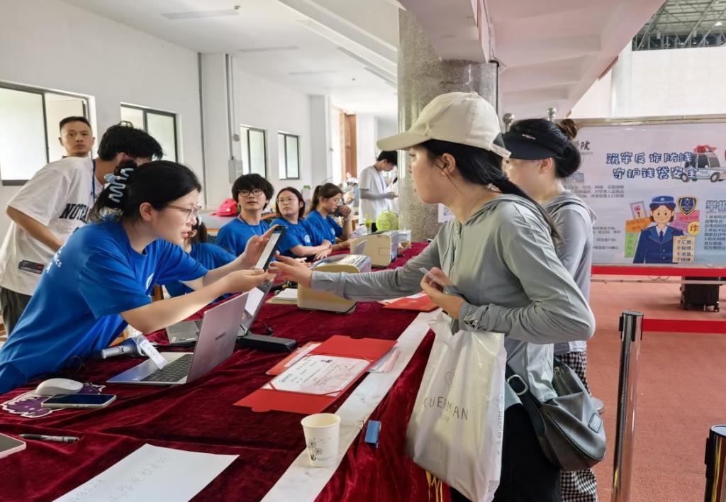在报到大厅,工作人员耐心细致地指导新生完成报到手续。从信息审查,绿色通道办理助学贷款,宿舍分配到校园卡的发放,以饱满的热情和周到的服务迎接每一位新同学。