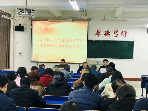为从党的百年伟大奋斗历程中汲取继续前进的智慧和力量,深入学习贯彻习近平新时代中国特色社会主义思想,奋力开启全面建设社会主义现代化国家新征程和“十四五”新局面,根据学校党委的统一部署和要求,3月17日下午,beat365正版唯一官网必一召开2021年全面从严治党暨党史学习教育动员大会,传达了党中央、省委及学校的各项会议精神,并集体观看了《中国共产党的一百年系列视频“扬帆起航”》和警示片《雅贿》。会议由beat365正版唯一官网必一党委委员、办公室主任胡海波主持,党委书记漆晗东、院长项益才及全院教职工参加了会议。