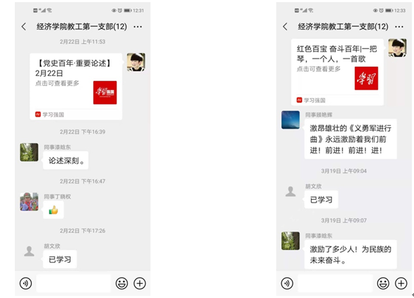 自2月21日至今,教工一支部书记每天从“学习强国”上选取“党史”学习栏目,通过对“红色百宝.奋斗百年”、“党史百年天天学”、“中国共产党百科”、“中国共产党的十万个为什么”等内容的学习,进一步加强了学习,增强了党员的使命感。